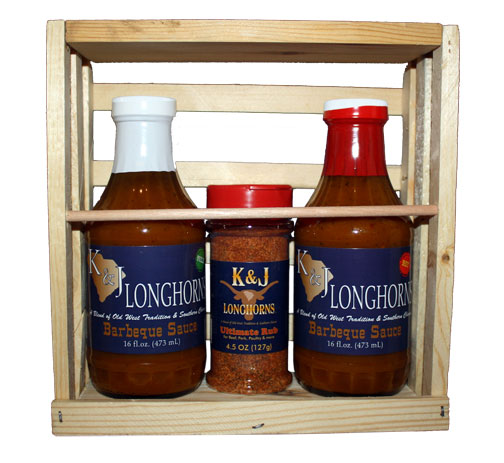 Blending a charming southern gift with a rugged feel, this gift crate include a 16 fl. oz bottle of both our Hot & Mild K & J Longhorns Gourmet Sauces, plus a 4.5 oz. bottle of o